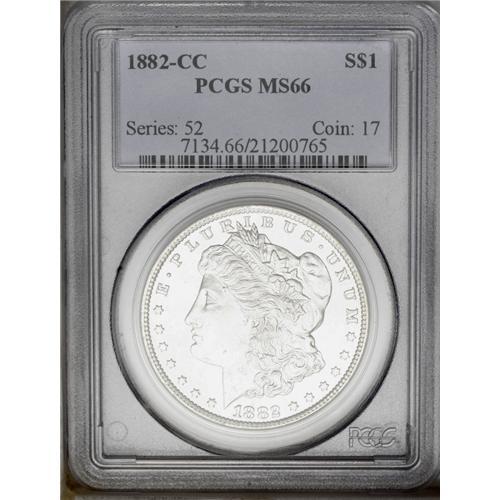 <B>1882-CC<img border='0' src='http://www.heritagecoins.com/images/star.gif' width=10 height=10>$1> MS66 PCGS.</B></I> Snow-white and frosty, with an exceptionally clean cheek. It would seem that a few very light field marks on the reverse are all that has kept this lovely specimen from a higher evaluation. <BR><BR><B>Important notice:</B> Heritage usually auctions material at the rate of 200-250 lots per hour. On some occasions eBay Live bid software or the Internet may not be able to keep up with the pace of the auction. We recommend placing a realistic absentee bid now as insurance to avoid disappointment. Occasionally the auctioneer may eliminate or reject an eBay Live bid, and the auctioneer may also reopen a lot after the close of the eBay live bidding (usually because we missed an audience bid), and may reject your bid even if it shows you as the winning bidder. By bidding via eBay Live, you agree that Heritage may award the lot to another bidder at its sole discretion under the circumstances described above or any other reasonable circumstances. Since eBay bids are not shown to us until we open the lot on the floor, we treat those bids just like floor bids. In most cases the floor responds before the eBay bid is presented to us, due to Internet lag time, so for consistency we have made it a policy that floor bids are always considered first over tie eBay live bids. Also please note that all Heritage lots purchased through eBay Live carry a 20% Buyer's Premium. Please make sure you read the Terms and Conditions before you bid. This lot is being auctioned in conjunction with a live floor auction by Heritage Galleries & Auctioneers. All final auction and invoice information will be supplied by Heritage Galleries & Auctioneers, and all other information should be considered preliminary. Lot:3340 <BR><BR><B>Winning Notification and Billing:</B> After the FINAL session in this auction is complete, Heritage will send e-mail and snail mail invoices. This process normally takes several days. All final auction and invoice information will be supplied by Heritage Galleries & Auctioneers, and all other information should be considered preliminary. <BR><BR>This auction will be conducted on a live auction floor and over the Internet through eBay Live. If you choose to place an absentee bid, please take a moment to <font color='#0000ff'><u><a href='http://pages.ebay.com/liveauctions/help/before/laabsentee.html'>learn how eBay Live absentee bidding works</a></u></font><font color='#000000'>