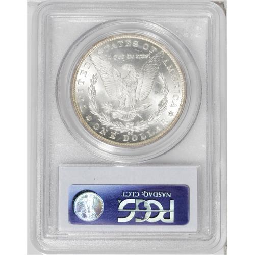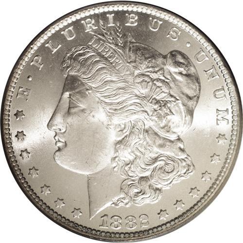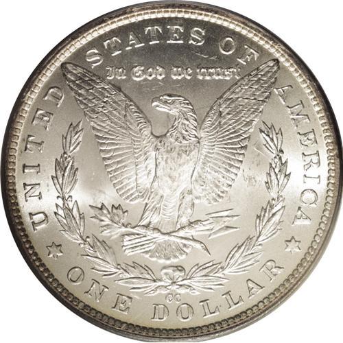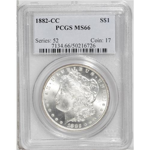 <B>1882-CC<img border='0' src='http://www.heritagecoins.com/images/star.gif' width=10 height=10>$1> MS66 PCGS.</B></I> The blazing luster of this snow-white Premium Gem is obviously its most noteworthy feature. Although uniformly frosted, the fields are somewhat brighter than the powerfully struck devices. A handful of wispy marks, on Liberty's cheek and in the left obverse field, are not overly distracting but preclude the MS67 grade assessment, which this beautiful coin would otherwise surely have received.