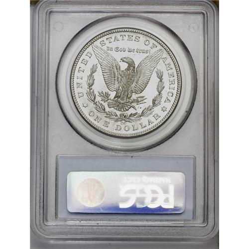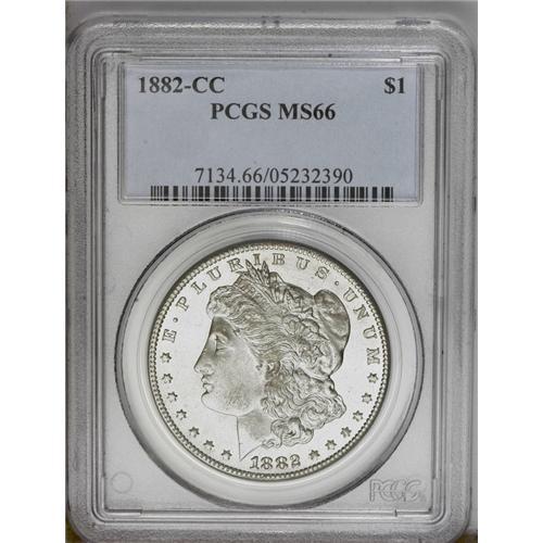 <B>1882-CC<img border='0' src='http://www.heritagecoins.com/images/star.gif' width=10 height=10>$1> MS66 PCGS.</B></I> The surfaces exude dazzling luster, and display occasional hints of light tan color on the central devices. Excellent definition is apparent throughout, including clarity in the hair over Liberty's ear and on the eagle's breast feathers. A few minor luster grazes do not distract.