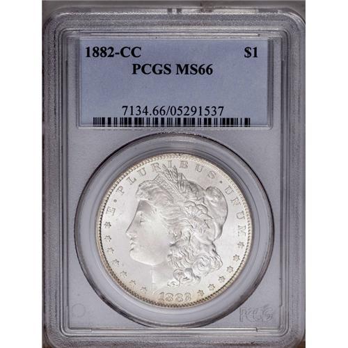 <B>1882-CC<img border='0' src='http://www.heritagecoins.com/images/star.gif' width=10 height=10>$1> MS66 PCGS.</B></I> This beautifully preserved Carson City dollar is generally brilliant, but has light honey-gold toning here and there, particularly near the date. The cheek is gorgeously smooth, and perhaps only slight striking softness in the centers denies a finer grade.