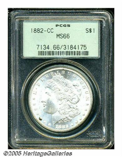 <B>1882-CC<S$1> MS66 PCGS.</B></I> Well struck up on the design elements, and white in color, except for toning spots in Liberty's hair, near the obverse rim at 7 and 12 o'clock, and near the reverse rim at 11 o'clock. As expected, the bright lustrous surfaces are well preserved.