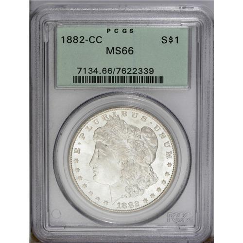 <B>1882-CC<img border='0' src='http://www.heritagecoins.com/images/star.gif' width=10 height=10>$1> MS66 PCGS.</B></I> With ample satiny luster and essentially untoned faces, this coin possesses memorable eye appeal. Trivial striking weakness on the hair over the ear is noted. <BR><BR><B>Important notice:</B> Heritage usually auctions material at the rate of 200-250 lots per hour. On some occasions eBay Live bid software or the Internet may not be able to keep up with the pace of the auction. We recommend placing a realistic absentee bid now as insurance to avoid disappointment. Occasionally the auctioneer may eliminate or reject an eBay Live bid, and the auctioneer may also reopen a lot after the close of the eBay live bidding (usually because we missed an audience bid), and may reject your bid even if it shows you as the winning bidder. By bidding via eBay Live, you agree that Heritage may award the lot to another bidder at its sole discretion under the circumstances described above or any other reasonable circumstances. Since eBay bids are not shown to us until we open the lot on the floor, we treat those bids just like floor bids. In most cases the floor responds before the eBay bid is presented to us, due to Internet lag time, so for consistency we have made it a policy that floor bids are always considered first over tie eBay live bids. Also please note that all Heritage lots purchased through eBay Live carry a 20% Buyer's Premium. Please make sure you read the Terms and Conditions before you bid. This lot is being auctioned in conjunction with a live floor auction by Heritage Galleries & Auctioneers. All final auction and invoice information will be supplied by Heritage Galleries & Auctioneers, and all other information should be considered preliminary. Lot:3342 <BR><BR><B>Winning Notification and Billing:</B> After the FINAL session in this auction is complete, Heritage will send e-mail and snail mail invoices. This process normally takes several days. All final auction and invoice information will be supplied by Heritage Galleries & Auctioneers, and all other information should be considered preliminary. <BR><BR>This auction will be conducted on a live auction floor and over the Internet through eBay Live. If you choose to place an absentee bid, please take a moment to <font color='#0000ff'><u><a href='http://pages.ebay.com/liveauctions/help/before/laabsentee.html'>learn how eBay Live absentee bidding works</a></u></font><font color='#000000'>