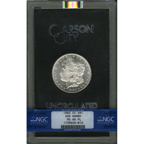 <B>1882-CC<img border='0' src='http://www.heritagecoins.com/images/star.gif' width=10 height=10>$1 MS66 Prooflike NGC.</B></I> A gorgeous premium Gem, gently toned and lovingly preserved. Not far from brilliant, although faint tan toning accompanies the right reverse. Included are the black box and certificate of GSA issue.
