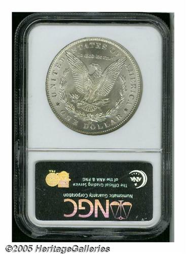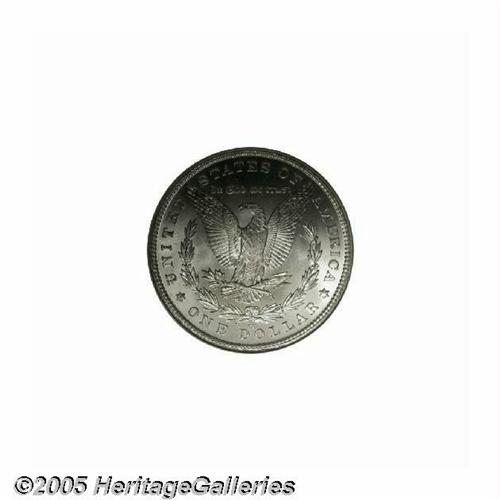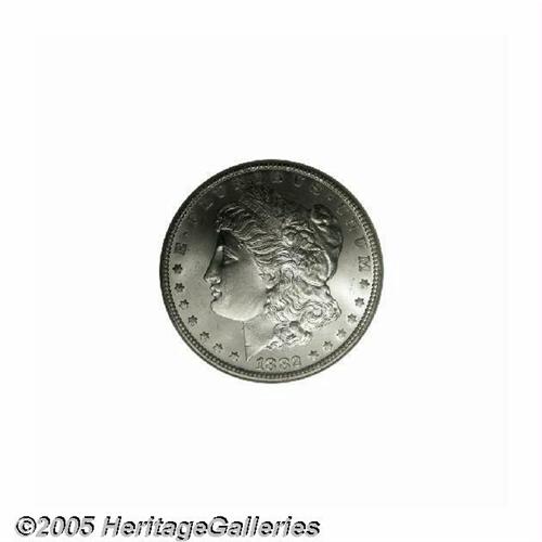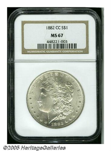 <B>1882-CC<S$1> MS67 NGC.</B></I> Although a substantial number of 1882-CC Dollars were released by the General Services Administration in the 1970s, from left over Treasury Hoard coins, most were heavily abraded, grading MS64 at best, and usually only MS60 or MS61. Any example of this issue in MS65 or better grade is elusive, and Superb Gem examples are virtually non-existent. This example has frosty silver luster with excellent definition of the design elements. The surfaces are creamy white, providing exceptional aesthetic appeal. Population: 26 in 67, 0 finer (6/05).