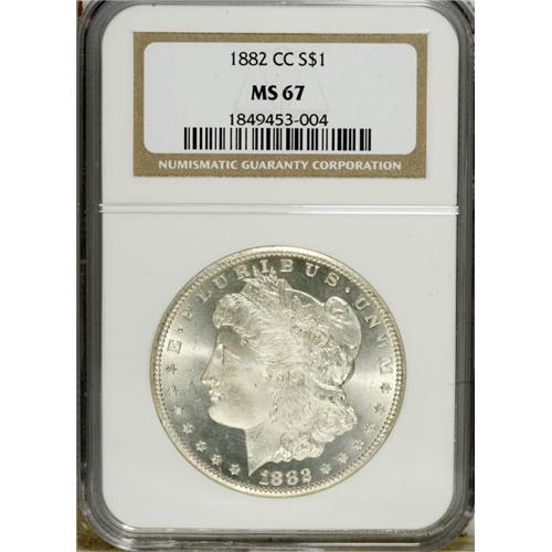 <B>1882-CC S$1 MS67 NGC.</B></I> Among Carson City Mint Morgan dollars, this issue is one of three common dates, being present in great quantities among coins distributed by the GSA in the 1970s. This Superb Gem specimen is fully brilliant and sharply struck with excellent contrast between lustrous devices and mirrored fields. No finer examples of this issue have been graded by NGC. Census: 38 in 67, 0 finer (1/07).<BR><BR><b>Shipping:</b> Coins & Currency (<a target="_blank" href="http://www.heritageauctions.com/common/shipping.php">view shipping information</a>)