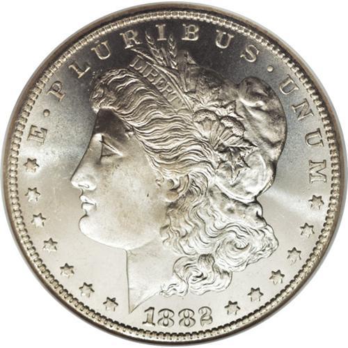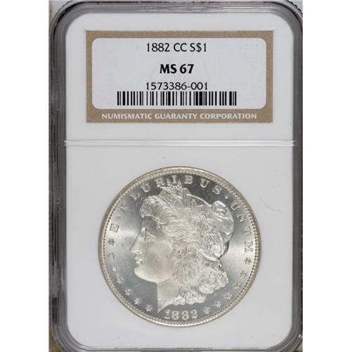 <B>1882-CC S$1 MS67 NGC.</B></I> The 1882-CC dollar is a voluminous date. David Bowers (2006) writes that: "The majority ... were not released at the time of issue but were held by the Treasury. Many decades later, over 600,000 were sold by the government ... to collectors. Today most of the original mintage survives in Unc., mostly out of numismatic hands." We present here a marvelous Superb Gem that is essentially untoned, and sharply struck, including excellent definition in the hair at Liberty's ear and on the eagle's breast feathers, areas that often are weak. Partially prooflike fields offer pleasing contrast with lightly frosted motifs, and aside form a few minor luster grazes, both sides are well preserved. Census: 41 in 67, 0 finer (3/07).<BR><BR><b>Shipping:</b> Coins & Currency (<a target="_blank" href="http://www.heritageauctions.com/common/shipping.php">view shipping information</a>)