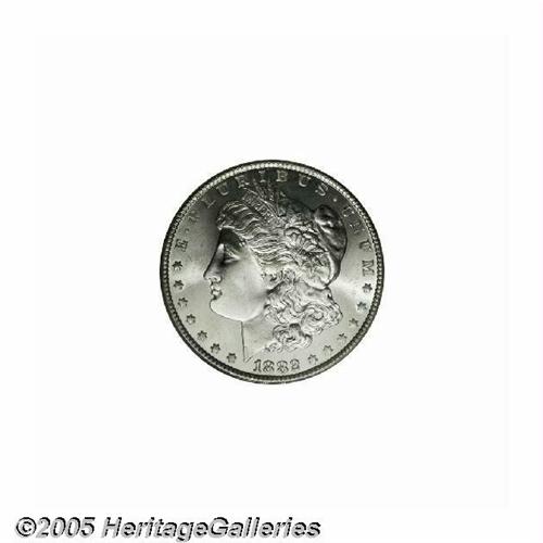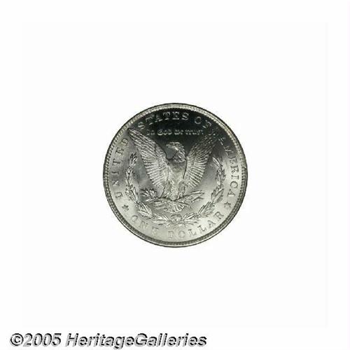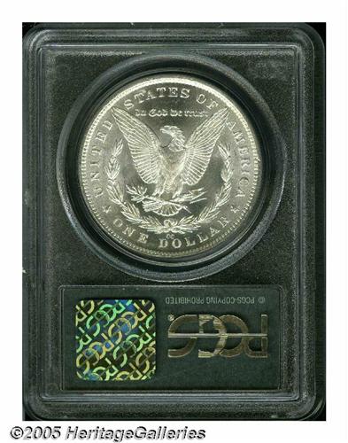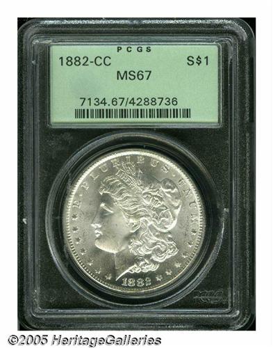 <B>1882-CC<S$1> MS67 PCGS.</B></I> Dollars from the Carson City mint are very seldom seen with smooth, unblemished surfaces. The ones that were distributed in the Western United States generally received rough handling and bagmarks are prevalent. Most of the GSA dollars were similarly heavily marked, but a few dozen escaped with minimal abrasions. This is an extraordinarily smooth coin that has a clean cheek on Liberty and thick, frosted mint luster. Sharply struck and brilliant except for a few dashes of grease that were struck into the planchet at the time of manufacture--located at the top of the obverse. Population: 44 in 67, 1 finer (6/05).