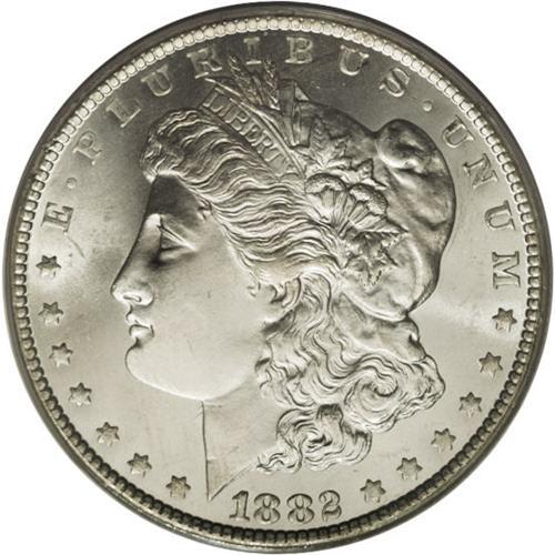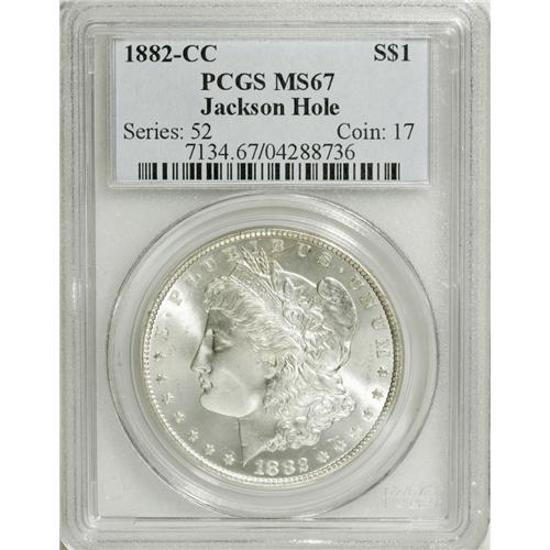 <B>1882-CC S$1 MS67 PCGS.</B></I> Ex: Jackson Hole. Dollars from the Carson City Mint are seldom seen with smooth, unblemished surfaces. Those that were distributed in the western United States generally received rough handling, and bagmarks are prevalent. Most of the GSA dollars were similarly heavily marked, but a few dozen escaped with minimal abrasions. This is an extraordinarily smooth coin that has a clean cheek on Liberty and thick, frosted mint luster. Sharply struck and brilliant except for a few dashes of grease that were struck into the planchet at the time of manufacture--located at the top of the obverse. Population: 47 in 67, 1 finer (2/07).<BR><I>From The Jackson Hole Collection.</B></I><BR><BR><b>Shipping:</b> Coins & Currency (<a target="_blank" href="http://www.heritageauctions.com/common/shipping.php">view shipping information</a>)