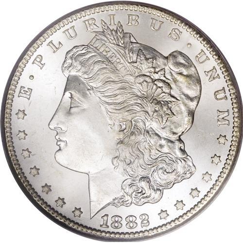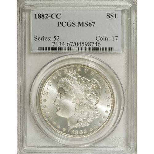 <B>1882-CC S$1 MS67 PCGS.</B></I> The 1882-CC is one of the most available Carson City Morgan dollars, due largely to large-scale releases as part of the GSA sales. Most examples of this issue have significant abrasions, but this Superb Gem is remarkably clean. The luster is strong, and the surfaces have just a touch of peach color against a backdrop of silver-white, and a hint of frost appears on the highpoints. A delightful Superb Gem representative. PCGS has graded just one coin finer (4/07).<BR><BR><b>Shipping:</b> Coins & Currency (<a target="_blank" href="http://www.heritageauctions.com/common/shipping.php">view shipping information</a>)