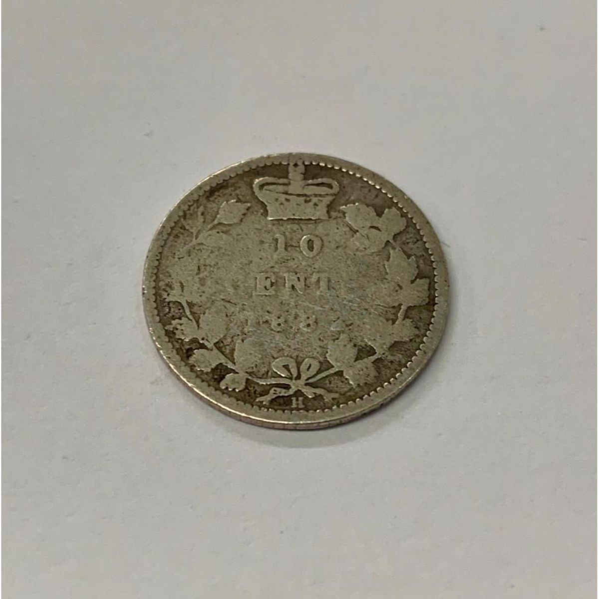 Obverse The portrait in left profile of Victoria is surrounded with the inscriptions "CANADA" and "VICTORIA DEI GRATIA REGINA" (Victoria, Queen by the grace of God) Several obverse varieties (which can be very difficult to distinguish) exist for different dates. These are connoted below with E1, E2, etc. Lettering: VICTORIA DEI GRATIA REGINA. CANADA Reverse The facial value above date is surrounded with a wreath of two maple boughs and a crown Lettering: 10 CENTS 1858 Features TypeStandard circulation coin Years1858-1901 Value10 Cents (0.1 CAD) MetalSilver (.9250) Weight2.32 g Diameter18.034 mm ShapeRound OrientationCoin alignment ↑↓