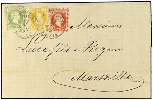 1882 Envelope to FRANCE bearing Franz Joseph 2 Kr yellow (Yvert 32), 3 Kr green (Yvert 33) and 5 Kr red (Yvert 34) tied by TRIEST cds with MARSEILLE arrival. Very attractive three colour franking.