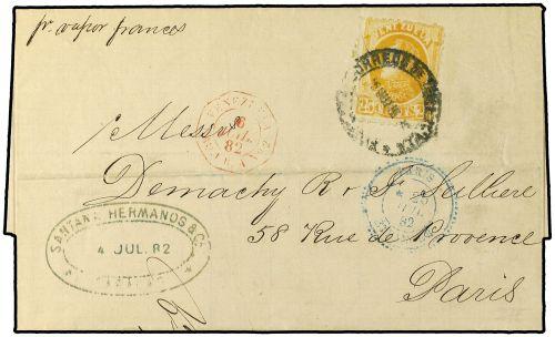 1882 Envelope to Paris franked 25c. tied by Caracas date stamp. Obverse also bears red octagonal maritime date stamp of France ´Venezuela * Paq. Fr. A No. 2´.