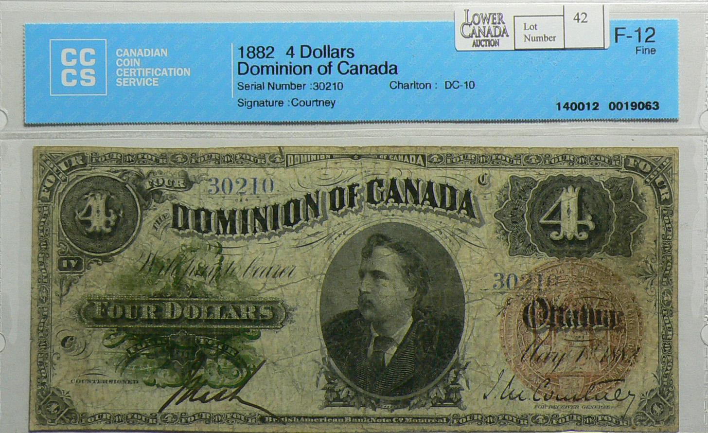1882 Four Dollars, DC-10, CCCS F-12, Courtney, Letter C, serial 30210.
