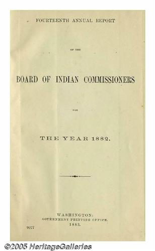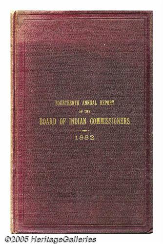 <B>1882 Fourteenth Annual Report of the Board of Indian Commissioners</B></I> Published 1883 by the Government Printing Office. Original clothbound form, probably a presentation copy. Included 64 pages of content. Rich text and fold-out 18 x 15" map of the west, showing locations of Indian reservations and tribal lands. Includes detailed reports on life and conditions at various reservations. Very nice condition, with minor surface wear on spine. 6" x 9". Lot:251