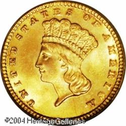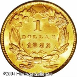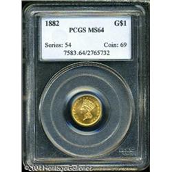 1882 G$1 MS64 PCGS. Sharply struck with bright, se <B>1882 G$1 MS64 PCGS.</B></I> Sharply struck with bright, semi-prooflike surfaces and a pronounced reddish-gold tint. On the reverse, a couple of marks are seen at the base and a small abrasion is to the right of the R of DOLLAR. Only 5,000 pieces were struck. <BR><BR><B>Important notice:</B> Heritage usually auctions material at the rate of 200-250 lots per hour. On some occasions eBay Live bid software or the Internet may not be able to keep up with the pace of the auction. We recommend placing a realistic absentee bid now as insurance to avoid disappointment. Occasionally the auctioneer may eliminate or reject an eBay Live bid, and the auctioneer may also reopen a lot after the close of the eBay live bidding (usually because we missed an audience bid), and may reject your bid even if it shows you as the winning bidder. By bidding via eBay Live, you agree that Heritage may award the lot to another bidder at its sole discretion under the circumstances described above or any other reasonable circumstances. Since eBay bids are not shown to us until we open the lot on the floor, we treat those bids just like floor bids. In most cases the floor responds before the eBay bid is presented to us, due to Internet lag time, so for consistency we have made it a policy that floor bids are always considered first over tie eBay live bids. Also please note that all Heritage lots purchased through eBay Live carry a 20% Buyer's Premium. Please make sure you read the Terms and Conditions before you bid. This lot is being auctioned in conjunction with a live floor auction by Heritage Galleries & Auctioneers. All final auction and invoice information will be supplied by Heritage Galleries & Auctioneers, and all other information should be considered preliminary. Lot:6475