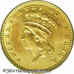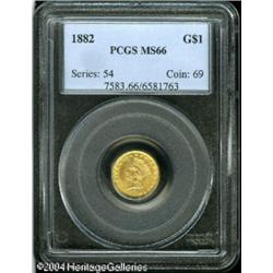 1882 G$1 MS66 PCGS. A scant 5,000 business strike <B>1882 G$1 MS66 PCGS.</B></I> A scant 5,000 business strike 1882 Gold Dollars were struck, and despite the stingy emission, the present premium Gem has vivacious cartwheel luster instead of prooflike fields. The meticulously struck devices are devoid of contact, and rich peach patina graces the left obverse and upper reverse fields. Population: 29 in 66, 33 finer (10/04). <BR><BR><B>Important notice:</B> Heritage usually auctions material at the rate of 200-250 lots per hour. On some occasions eBay Live bid software or the Internet may not be able to keep up with the pace of the auction. We recommend placing a realistic absentee bid now as insurance to avoid disappointment. Occasionally the auctioneer may eliminate or reject an eBay Live bid, and the auctioneer may also reopen a lot after the close of the eBay live bidding (usually because we missed an audience bid), and may reject your bid even if it shows you as the winning bidder. By bidding via eBay Live, you agree that Heritage may award the lot to another bidder at its sole discretion under the circumstances described above or any other reasonable circumstances. Since eBay bids are not shown to us until we open the lot on the floor, we treat those bids just like floor bids. In most cases the floor responds before the eBay bid is presented to us, due to Internet lag time, so for consistency we have made it a policy that floor bids are always considered first over tie eBay live bids. Also please note that all Heritage lots purchased through eBay Live carry a 20% Buyer's Premium. Please make sure you read the Terms and Conditions before you bid. This lot is being auctioned in conjunction with a live floor auction by Heritage Galleries & Auctioneers. All final auction and invoice information will be supplied by Heritage Galleries & Auctioneers, and all other information should be considered preliminary. Lot:6476