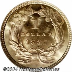 <table><tr><td><table><tr><td>1882 G$1 MS67 NGC. While many semi-prooflike and fully prooflike examples of this issue are known in today's hobby, the present example exhibits a finish that would best be described as frosty. Nevertheless, glowing tendencies in the fields are evident at a few select angles. All areas are smooth with crisp striking definition and an even endowment of golden-rose coloration. A conditionally rare offering from an original business strike mintage of 5,000 pieces. Population: 36 in 67, 7 finer (4/04). <BR><BR><B>Important notice:</B> Heritage usually auctions material at the rate of 200-250 lots per hour. On some occasions eBay Live bid software or the Internet may not be able to keep up with the pace of the auction. We recommend placing a realistic absentee bid now as insurance to avoid disappointment. Occasionally the auctioneer may eliminate or reject an eBay Live bid, and the auctioneer may also reopen a lot after the close of the eBay live bidding (usually because we missed an audience bid), and may reject your bid even if it shows you as the winning bidder. By bidding via eBay Live, you agree that Heritage may award the lot to another bidder at its sole discretion under the circumstances described above or any other reasonable circumstances. Since eBay bids are not shown to us until we open the lot on the floor, we treat those bids just like floor bids. In most cases the floor responds before the eBay bid is presented to us, due to Internet lag time, so for consistency we have made it a policy that floor bids are always considered first over tie eBay live bids. Also please note that all Heritage lots purchased through eBay Live carry a 20% Buyer's Premium. Please make sure you read the Terms and Conditions before you bid. <BR><BR><B>IMPORTANT ANNOUNCEMENT ABOUT RESERVES:</B> Heritage now divulges all reserves on its web site 7 days before every auction. If you want to know whether the reserve on this lot has been met, and if not, what the reserve amount is, please visit this lot page on the HeritageCoin.com web site, or email: bid@HeritageGalleries.com </span></font></td></tr></table></td></tr></table>