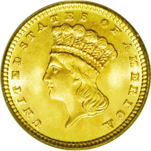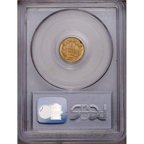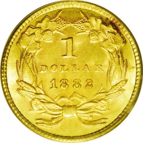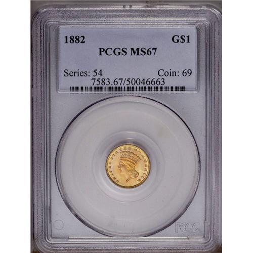 <B>1882<G$1> MS67 PCGS.</B></I> This well struck Superb Gem has potent luster and a seemingly pristine obverse. The reverse is mostly undisturbed, but there are a couple of deep crimson toning spots visible on the right side. A combination of pink-orange and mint-green color collide on each side. A mere 5,000 pieces were struck. A collection of Gem Type Three Philadelphia Mint gold dollars would be a spectacular undertaking for the advanced numismatist. Population: 33 in 67, 6 finer (4/06).