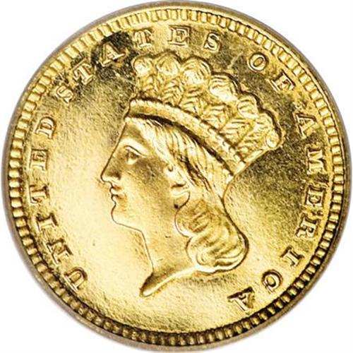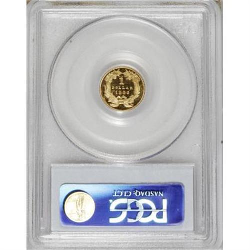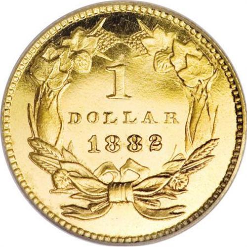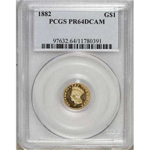<B>1882 G$1 PR64 Deep Cameo PCGS.</B></I> Jeff Garrett and Ron Guth (2006) write of the 1882 proof gold dollar: "This date marks the first year that true proof gold dollars are actually available without too much difficulty." The authors' contention notwithstanding, Deep Cameo specimens, such as the near-Gem in this lot, are challenging. A gold-on-black appearance reaches out to the viewer, and the sharply struck design elements add extra appeal. Truly an impressive coin. Population: 3 in 64 Cameo, 5 finer (12/07).<BR><BR><b>Shipping:</b> Coins & Currency (<a target="_blank" href="http://www.heritageauctions.com/common/shipping.php">view shipping information</a>)