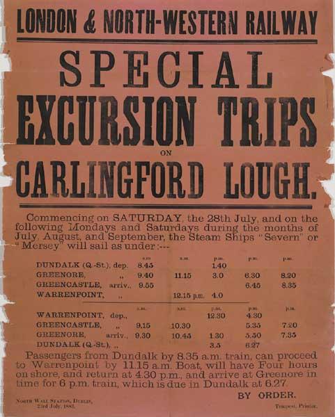 Green railway advertising poster for excursions to Warrenpoint 30 July 1882. Also with London and North Western Railways advertising poster for Carlingford Lough excursion trips 28 July 1883, issued by North Wall Station Dublin. (2 items)