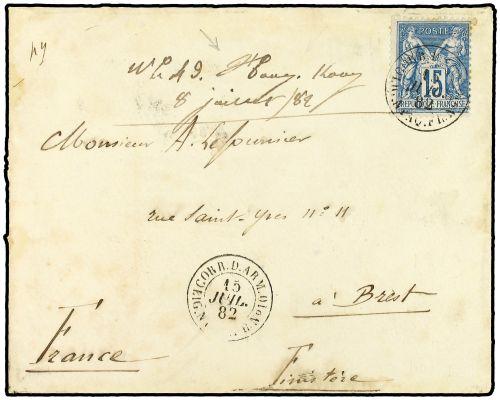 1882 HONG KONG a FRANCIA. Sobre enviado por un militar francés desde Hong kong. Indicación manuscrita en el frente "Hong Kong-8 juillet 1882". Franqueada con sello de 15 cts. azul (tarifa militar) y mat. CORR. D. ARM/LIG. N. PAQ. FR. Nº 10. MAGNIFICA y RARA.