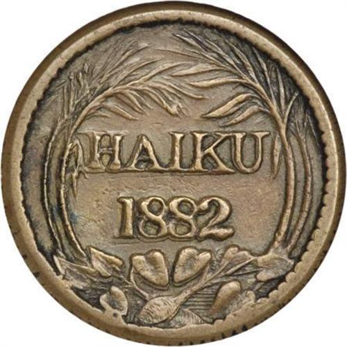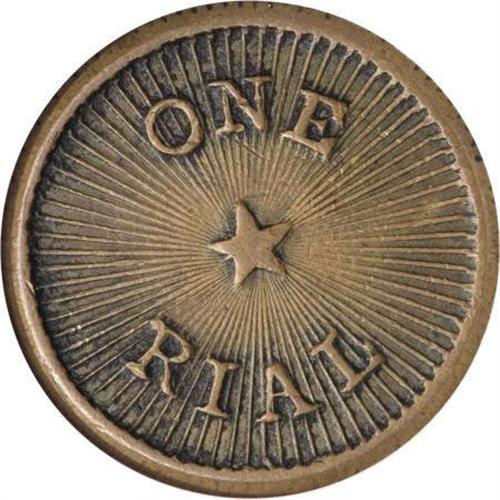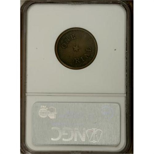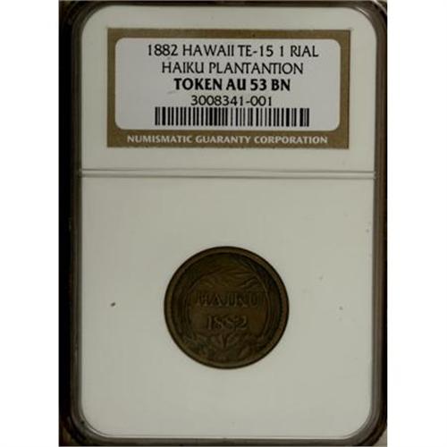 <B>1882 Haiku Plantation One Rial Token AU53 NGC.</B></I> TE-15. The Haiku sugar plantation was an early business venture of the famous partnership of Alexander and Baldwin, today a giant in the agricultural, real estate, and shipping industries of Hawaii. A lightly circulated chocolate-brown token with minor gray build-up and moderate strike doubling on the obverse. Listed on page 380 of the 2008 <I>Guide Book.</B></I><BR><BR><b>Shipping:</b> Coins & Currency (<a target="_blank" href="http://www.heritageauctions.com/common/shipping.php">view shipping information</a>)