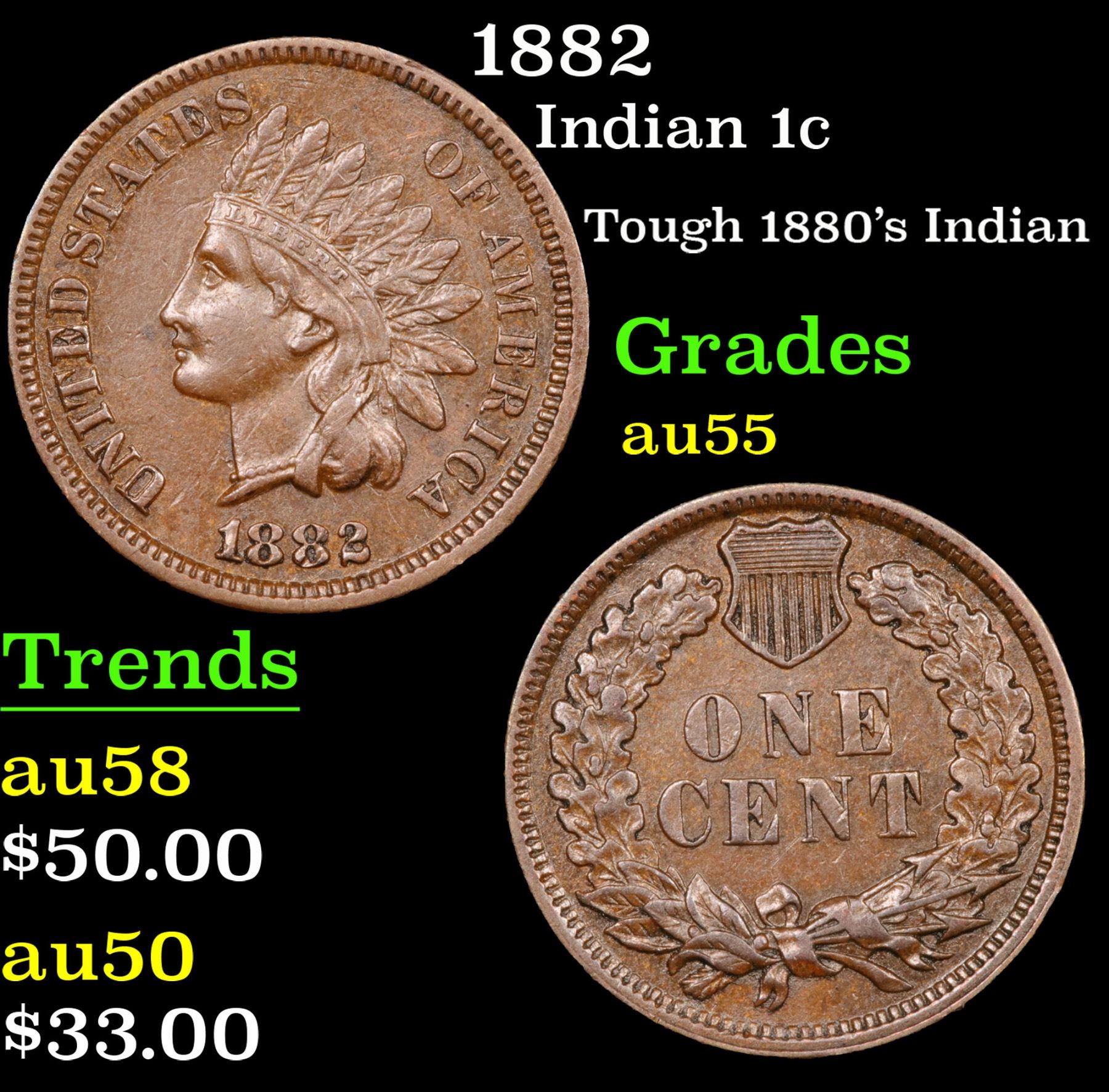 1882 Tough 1880's Indian . Indian Cent 1c Grades Choice AU.