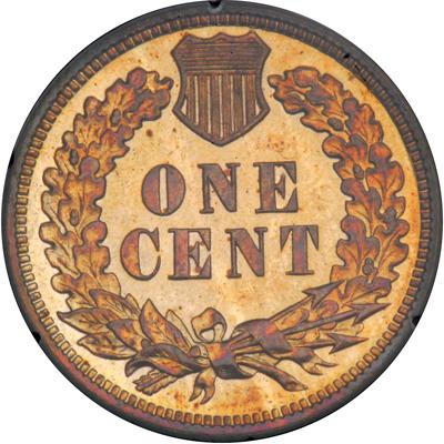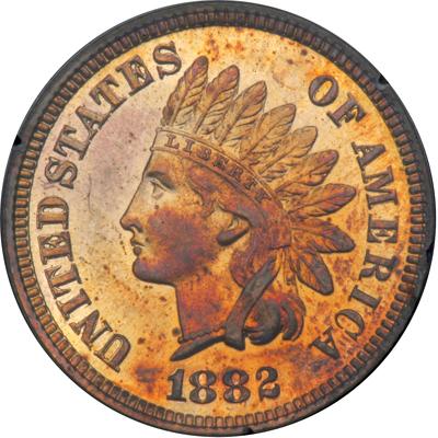 1882 Indian Head Cent. PCGS graded Proof 64 Red. Housed in a First Generation Holder. 3,100 pieces struck. Deep mint red color which livens the Proof mirror surface. Devices are very sharply impressed by the dies. Pop 25; 31 finer (PCGS # 2335).