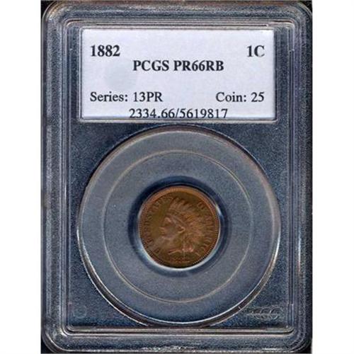 <b>1882 Indian Head Cent. PCGS graded PF66 RB.</b> A satiny golden red to purplish brown gem with strong showing on the more matte-like devices. As is often seen, the imprint that was left by the dies has excellent sharpness on an 1882 Proof, yet even more forcefully, this coin stands apart for this date with its boldness and detail. It has a wonderful clear sharp strike. Proof mintage was only 3,100 pieces <b>(PCGS # 2334)</b>