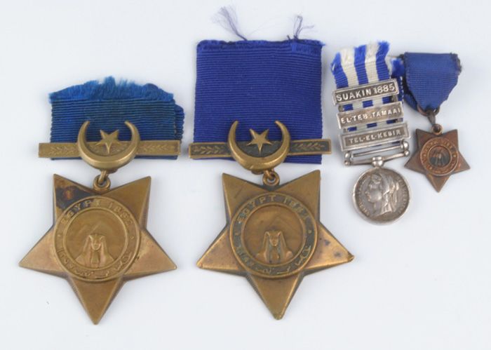 1882 Khedive's Star with contemporary unofficial engraved naming on reverse '16429 W.PE. Hutchings R.E.' Also with an unnamed as issued 1882 Khedive's Star and a contemporary miniature pair comprising of Egypt Medal with clasps Suakin 1885, El-Teb-Tamaai, Tel-El-Kebir and an 1882 Khedive's Star.