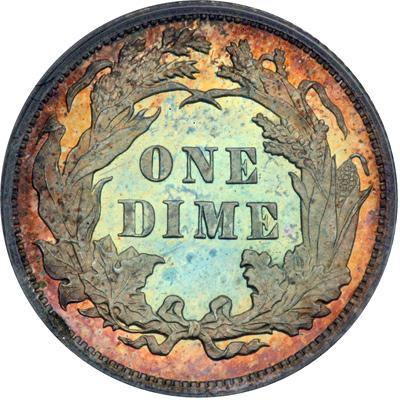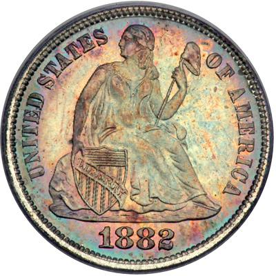 1882 Liberty Seated Dime. PCGS graded Proof 66 PQ. CAC Approved. Eye catching multi-colored toning exists on both sides. Only 1,100 struck. Pop 14; 10 finer, 9 in 67, 1 in 68 (PCGS # 4779) .