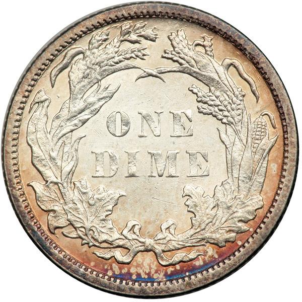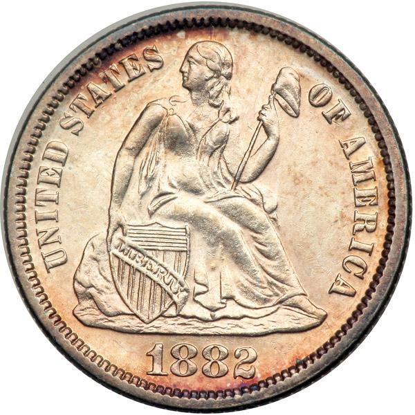 1882 Liberty Seated Dime. PCGS graded MS-62. Well struck, nicely toned with prooflike surfaces (PCGS # 4690) .