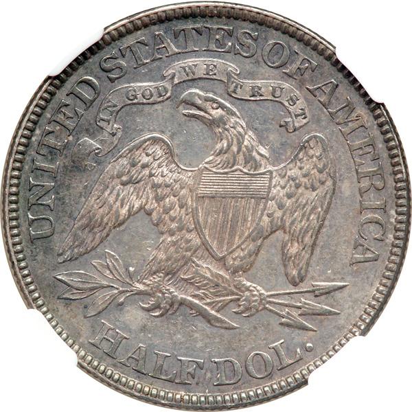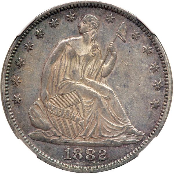 1882 Liberty Seated Half Dollar. NGC graded AU-58. Even grey toning with semi-reflective surfaces. Only 4,400 pieces minted.