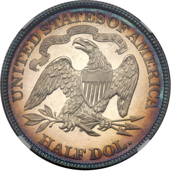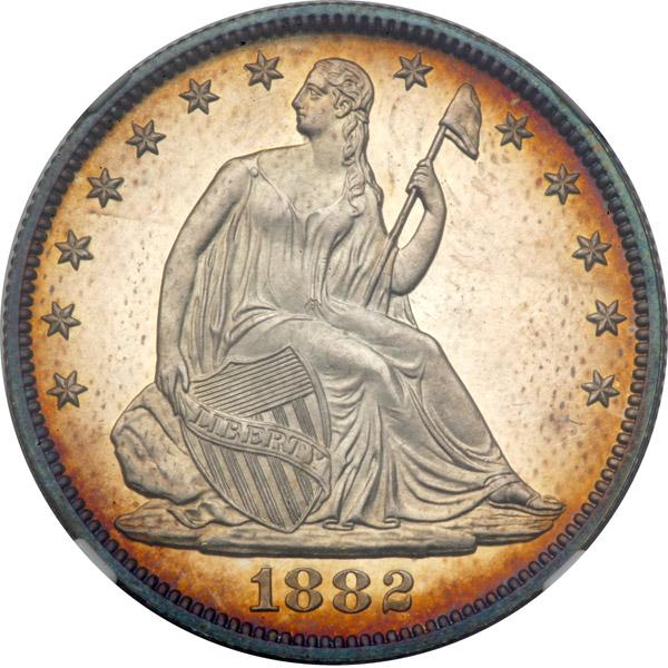 1882. NGC graded Proof 67 Cameo CAC Approved. Lovely delicate golden toning with edges of iridescent electric blue. Only 1,100 struck. It is almost inconceivable to us to imagine a more original, attractive specimen than this. The coin is a knock-out. One for the specialist or connoisseur of the series. Pop 4; 2 finer with 1 in 67*, 1 in 68*.
