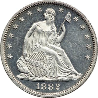 1882 Liberty Seated Half Dollar. PCGS graded Proof 60. Attractive frost-on-mirrors Proof with light hairlines but no spotting or field injury (PCGS # 6443) .