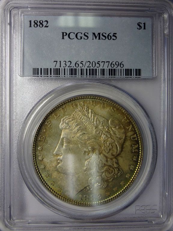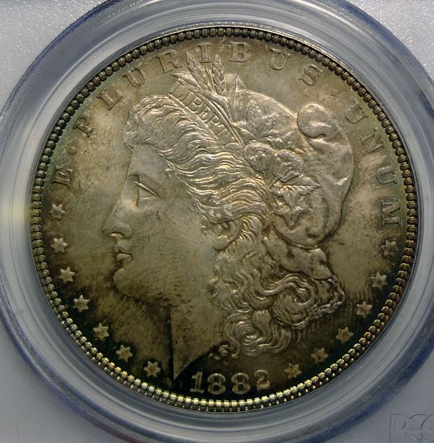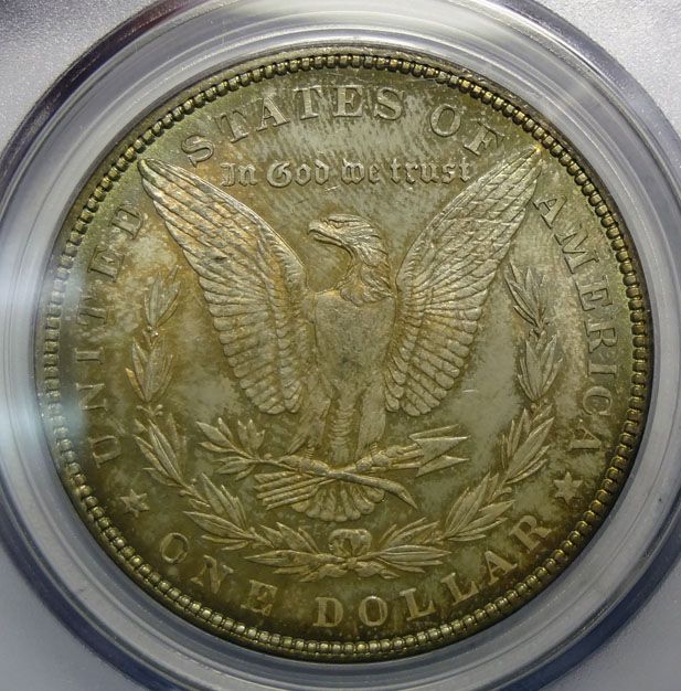 A HIGH GRADE MORGAN DOLLAR WITH BEAUTIFUL COLORS, ESTIMATE $480.00 TO $525.00