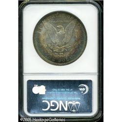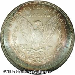 <B>1882<img border='0' src='http://www.heritagecoins.com/images/star.gif' width=10 height=10>$1 MS66 <img border='0' src='http://www.heritagecoins.com/images/star.gif' width=10 height=10> NGC.</B></I> The star designation no doubt stems from the splendid multicolored toning that adorns both sides of this more difficult early P-mint. Those who collect toned, high quality Morgan Dollars really should have a look. Lot:10065