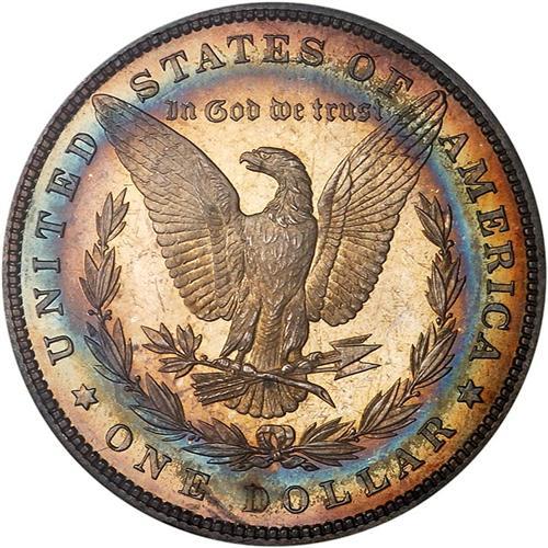 From a proof mintage of 1100, with only eleven coins certified finer. This blue, grey and yellow toned gem coin Bids at $11,200 and listed by CU at $18,500.