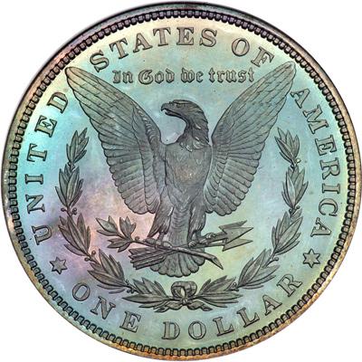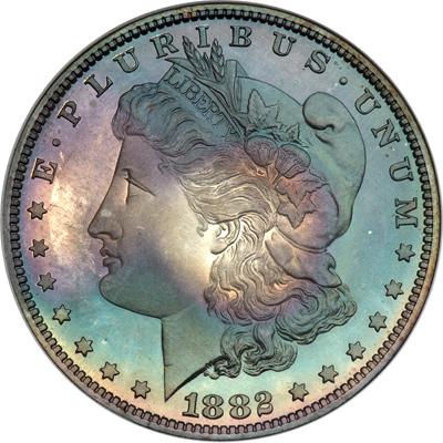 1882 Morgan Dollar. NGC graded Proof 68 PQ. 1,100 pieces minted. An astounding superb gem Morgan covered with beautiful multi-colored toning. Great eye appeal. Loaded with pizzazz! Undoubtedly among the finest known examples of this popular, 1880s date. The surfaces are essentially flawless and each side is iridescent. The devices show a substantial amount of mint frost under the color and contrast markedly against the full mirrored fields. A superb coin that must be seen to be fully appreciated. Pop 6; 1 finer in 68 Star (PCGS # 7317) .