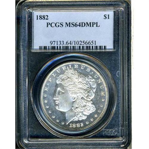 <b>1882 Morgan Dollar. PCGS graded MS64 DMPL.</b> A brilliant and highly lustrous coin that has well preserved prooflike surfaces capped by frosted devices. Notice the clean cheek on Liberty <b>(PCGS # 97133)</b>