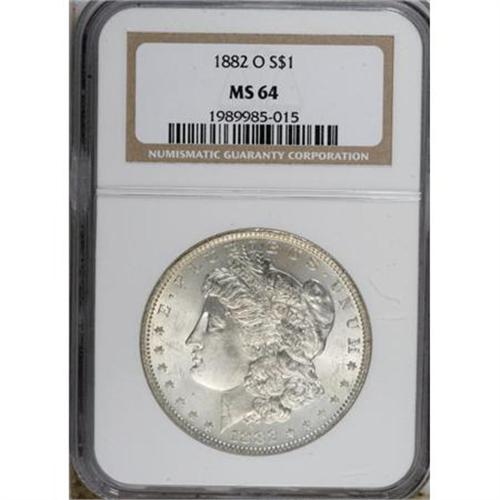 <B>1882-O $1 MS64 NGC.</B></I> NGC Census: (4569/409). PCGS Population (4003/594). Mintage: 6,090,000. Numismedia Wsl. Price for NGC/PCGS coin in MS64: $60. (#7136)<BR><BR><B>Coin Engraver:</B> George T. Morgan<BR><BR><b>Shipping:</b> Coins & Currency (<a target="_blank" href="http://www.heritageauctions.com/common/shipping.php">view shipping information</a>)