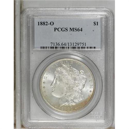 <B>1882-O $1 MS64 PCGS.</B></I> PCGS Population (3935/582). NGC Census: (4529/405). Mintage: 6,090,000. Numismedia Wsl. Price for NGC/PCGS coin in MS64: $60. (#7136)<BR><BR><b>Shipping:</b> Coins & Currency (<a target="_blank" href="http://www.heritageauctions.com/common/shipping.php">view shipping information</a>)