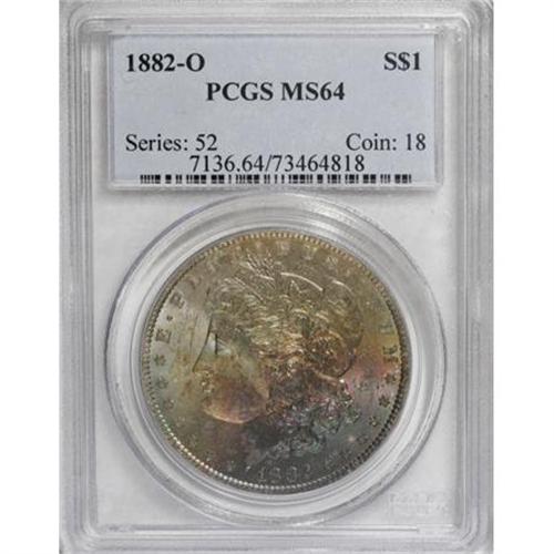<B>1882-O $1 MS64 PCGS.</B></I> <B>1882-O S$1 MS64 PCGS.</B></I> Glowing luster emanates from both sides of this attractive near-Gem. The reverse displays just a whisper of gold color in the upper portions, while the obverse is bathed with iridescent hues of cobalt-blue, lavender, golden-tan, and apple-green. The strike is above average for the issue. A few minor marks on each side define the grade.<BR><BR><b>Shipping:</b> Coins & Currency (<a target="_blank" href="http://www.heritageauctions.com/common/shipping.php">view shipping information</a>)