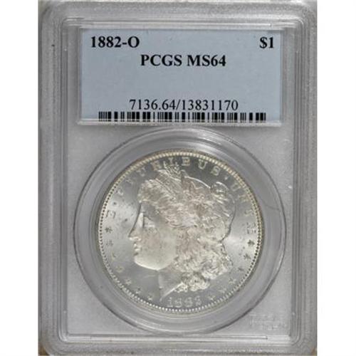 <B>1882-O $1 MS64 PCGS.</B></I> PCGS Population (3988/587). NGC Census: (4541/408). Mintage: 6,090,000. Numismedia Wsl. Price for NGC/PCGS coin in MS64: $60. (#7136)<BR><BR><B>Coin Engraver:</B> George T. Morgan<BR><BR><b>Shipping:</b> Coins & Currency (<a target="_blank" href="http://www.heritageauctions.com/common/shipping.php">view shipping information</a>\)