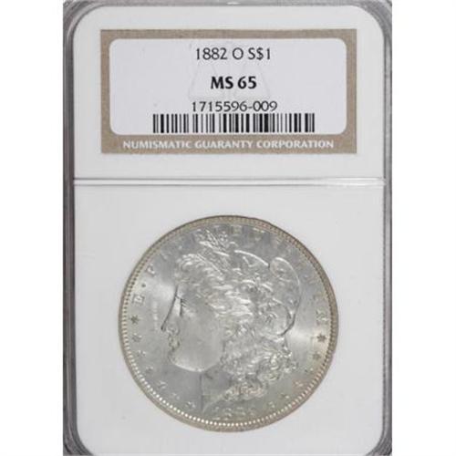 <B>1882-O $1 MS65 NGC.</B></I> Faint traces of gold color visit the obverse peripheries of this highly lustrous Gem. Minimally abraded and sharply struck.<BR><BR><B>Coin Engraver:</B> George T. Morgan<BR><BR><b>Shipping:</b> Coins & Currency (<a target="_blank" href="http://www.heritageauctions.com/common/shipping.php">view shipping information</a>)