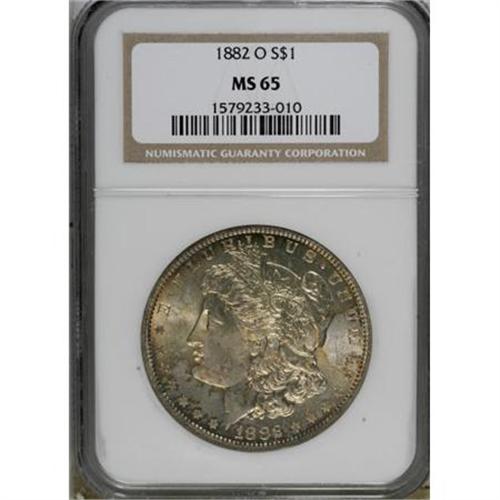 <B>1882-O $1 MS65 NGC.</B></I> Decisively struck with wonderful luster, a delightful representative of this popular O-mint Morgan issue. Elegant golden-tan toning covers much of the obverse, while the reverse shows rings of champagne and peach around an essentially untoned center. NGC has graded only 10 numerically finer examples (2/08).<BR><BR><B>Coin Engraver:</B> George T. Morgan<BR><BR><b>Shipping:</b> Coins & Currency (<a target="_blank" href="http://www.heritageauctions.com/common/shipping.php">view shipping information</a>)