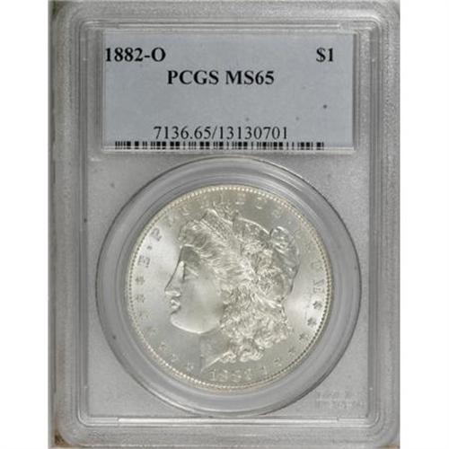 <B>1882-O $1 MS65 PCGS.</B></I> Virtually untoned with swirling satiny luster and well struck devices with excellent definition in the centers. The cheek and obverse fields are unusually clean and nearly abrasion-free. <BR><BR><b>Shipping:</b> Coins & Currency (<a target="_blank" href="http://www.heritageauctions.com/common/shipping.php">view shipping information</a>)