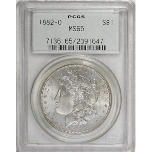 <B>1882-O $1 MS65 PCGS.</B></I> Delicate gold toning visits this meticulously struck and lustrous Gem. Marks are inconsequential, as are a pair of milk-gray spots on the lower right reverse quadrant. Housed in an old green label holder.<BR><BR><B>Coin Engraver:</B> George T. Morgan<BR><BR><b>Shipping:</b> Coins & Currency (<a target="_blank" href="http://www.heritageauctions.com/common/shipping.php">view shipping information</a>)