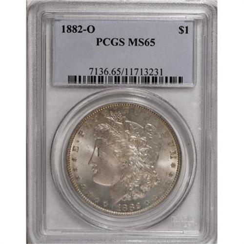 <B>1882-O $1 MS65 PCGS.</B></I> A brilliant obverse is accompanied by faint peripheral toning, with deeper reverse toning that subdues the mint frost. An attractive and desirable Gem.<BR><BR><B>Coin Engraver:</B> George T. Morgan<BR><BR><b>Shipping:</b> Coins & Currency (<a target="_blank" href="http://www.heritageauctions.com/common/shipping.php">view shipping information</a>)