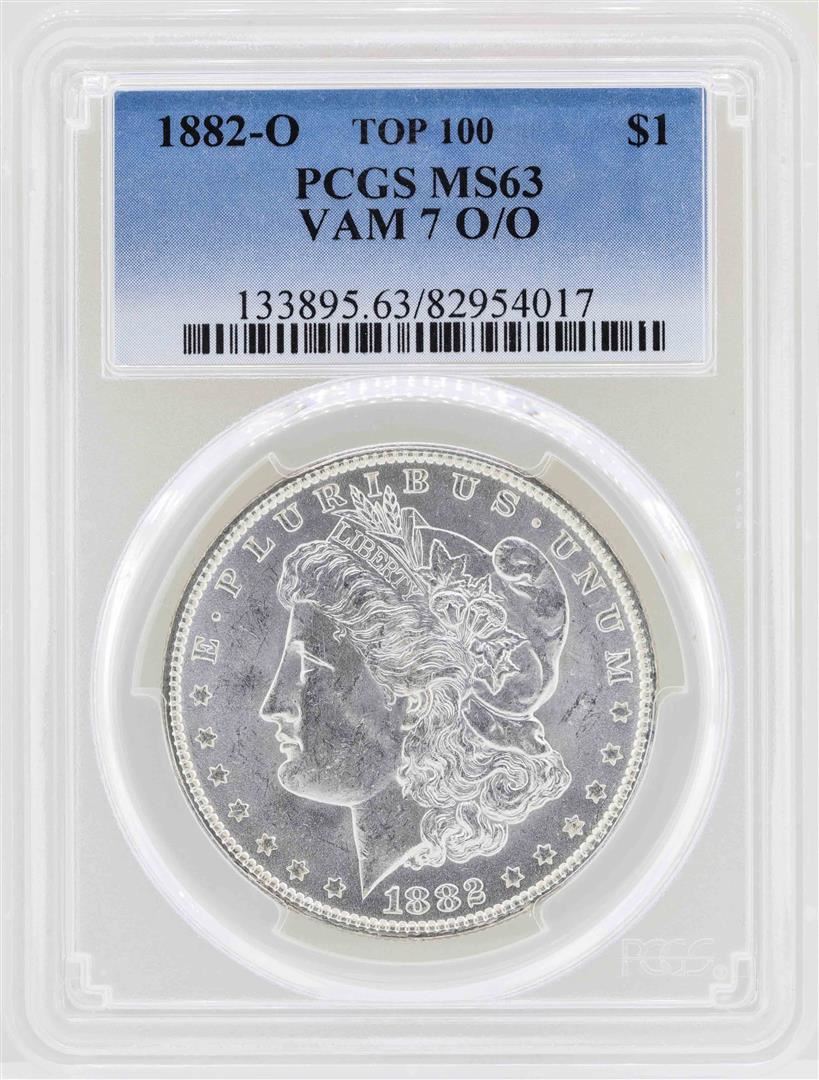 One 1882-O $1 Morgan Silver Dollar Coin VAM 7 O/O Top 100 PCGS MS63. PCGS Graded.